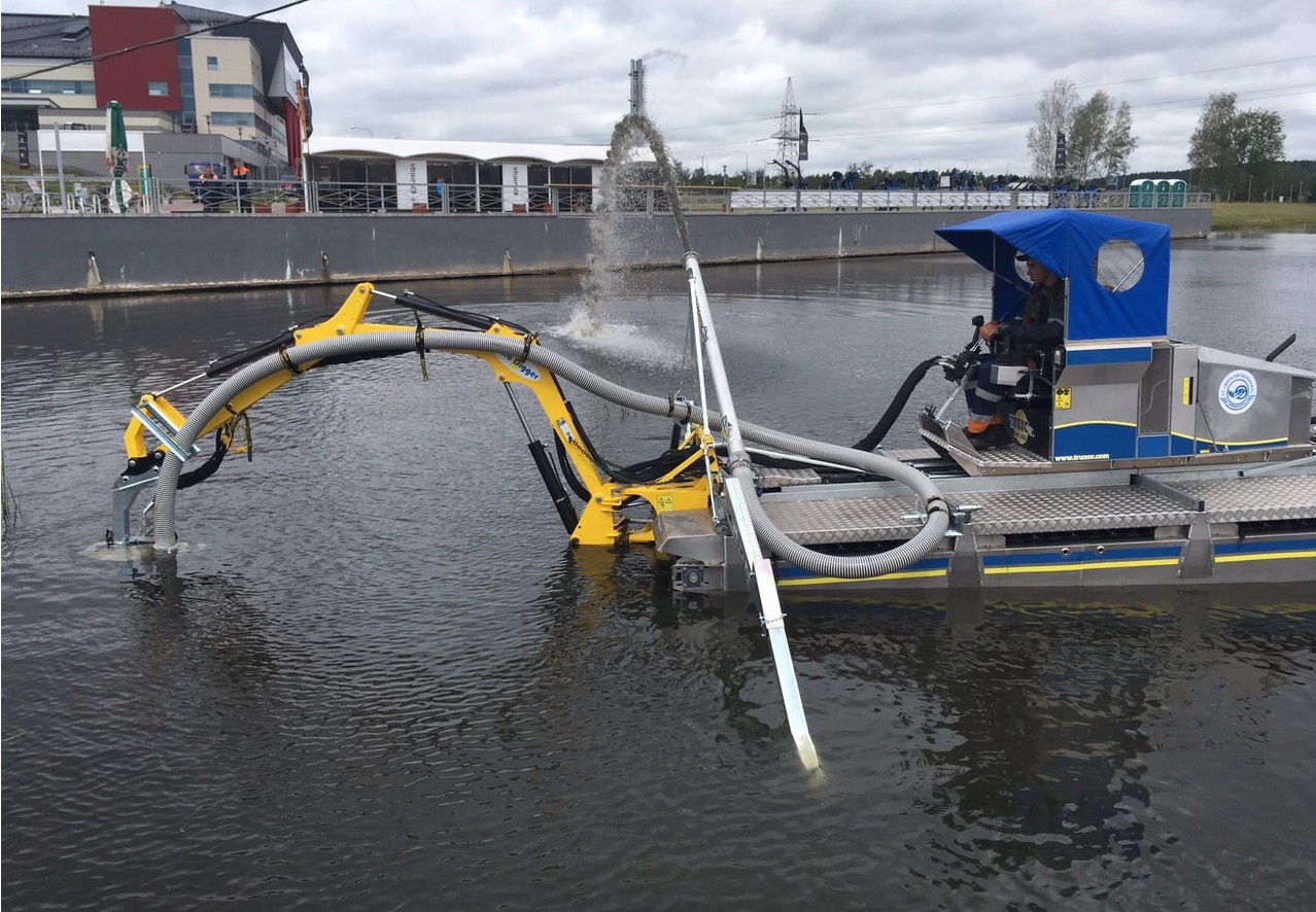 Расчистка водоемов в Минске – это не только активная работа водолазов и других рабочих в течение всего светового дня, но и применение современной мобильной техники, которая позволяет расширить комплекс очистки и ускорить процесс. В нынешнем году для уборки водорослей водоканал использует 3 единицы механизированной техники – это 2 машины Berky (отличаются высоким объемом загрузки, машины полностью водоплавающие) и механизированный самоходный комплекс Truxor (высокая маневренность и проходимость даже на узких участках каналов, возможность покоса водной растительности на мелководье, очистка береговой линии как с воды, так и с суши).